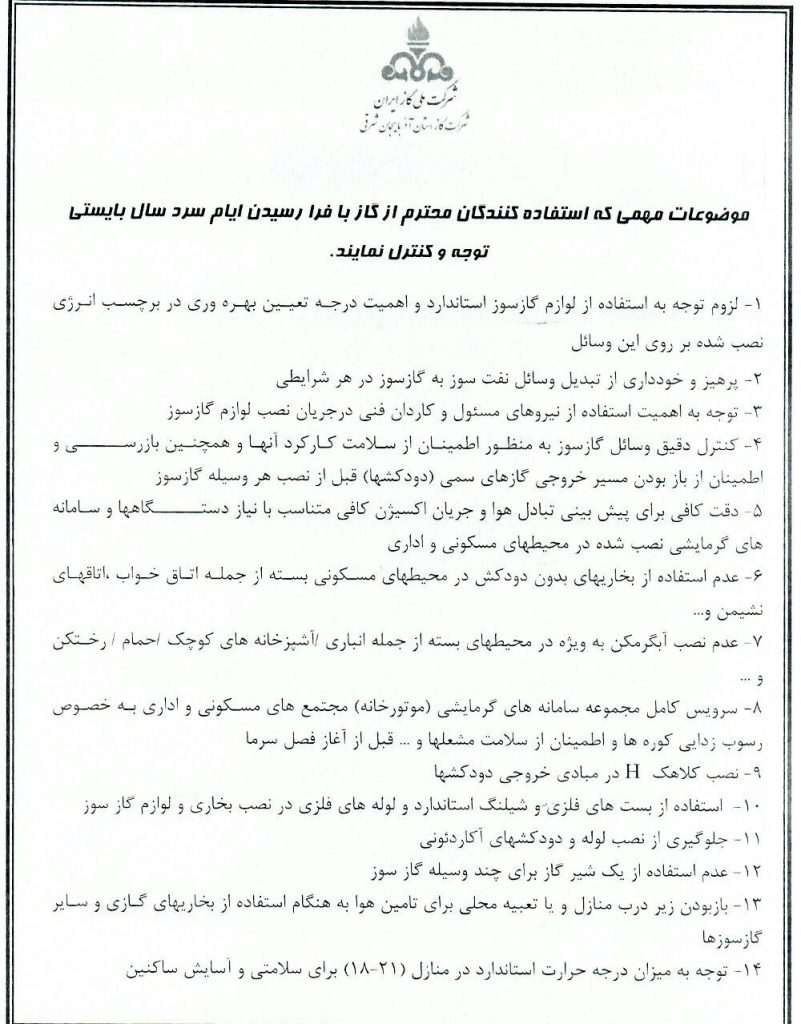 موضوعات مهمی که استفاده کنندگان محترم از گاز با فرا رسیدن ایام سرد سال بایستی توجه و کنترل کنند.