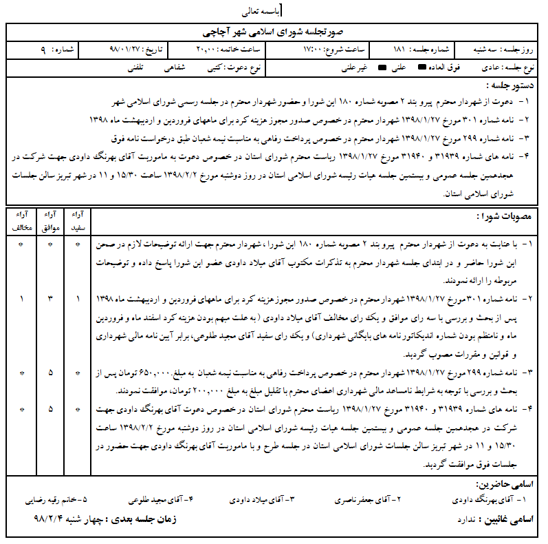 مصوبات جلسه شماره ۱۸۱ سه شنبه به تاریخ ۱۳۹۸/۰۱/۲۷شورای اسلامی اسلامی شهر آچاچی: