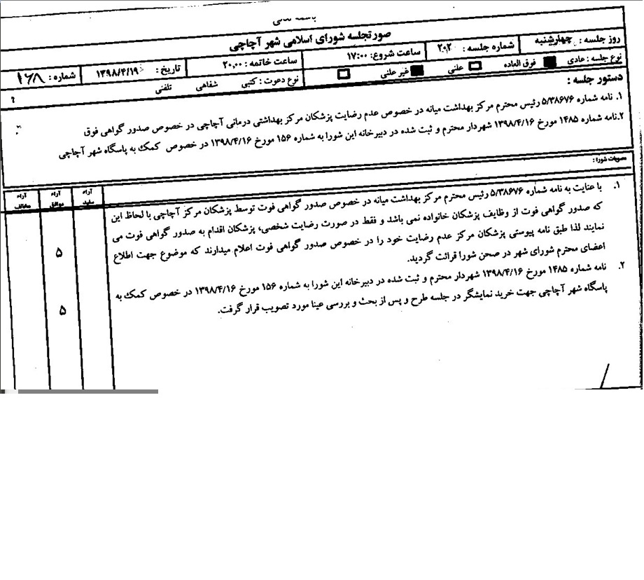 مصوبات جلسه شماره 202 چهارشنبه به تاریخ 98/04/19شورای اسلامی اسلامی شهر آچاچی: