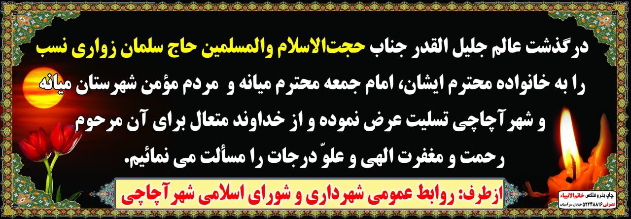 با کمال تاسف درگذشت عالم جلیل القدر جناب حجتالاسلام والمسلمین حاج سلمان زواری نسب را به خانواده محترم ایشان، امام جمعه محترم میانه و مردم مؤمن شهرستان میانه و شهر آچاچی تسلیت عرض میکنیم و از خداوند متعال برای آن مرحوم رحمت و مغفرت الهی و علوّ درجات را مسألت مینمایم.